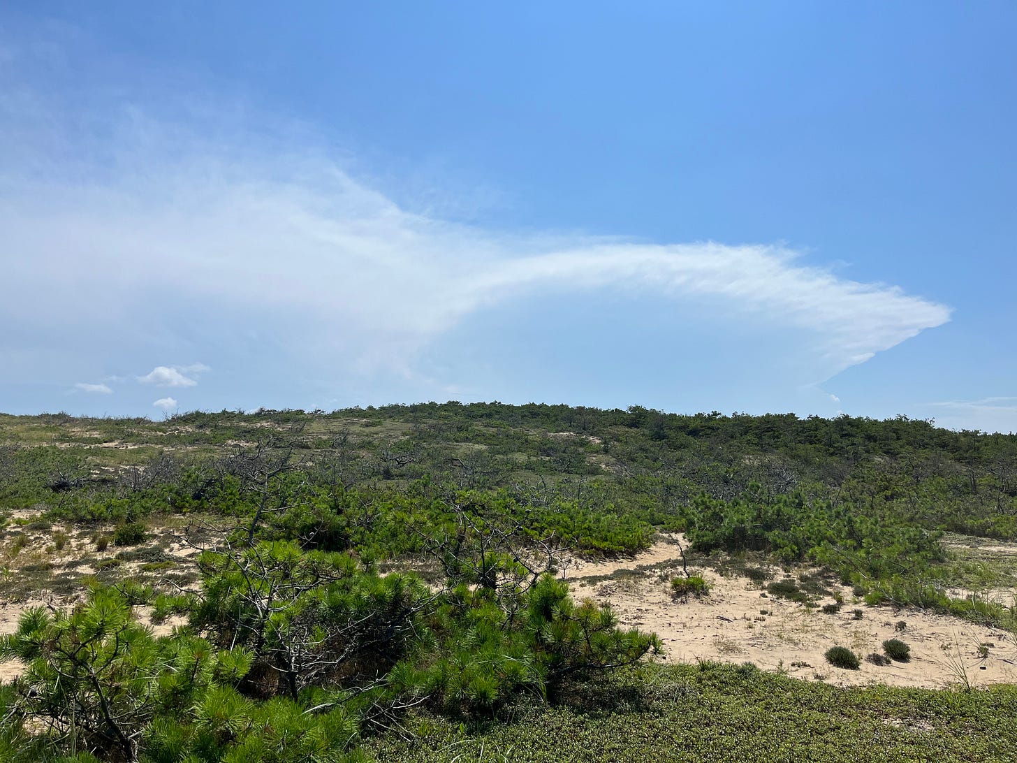 I spent the afternoon wandering Wellfleet and watching the storms bubble around me. The above timelapse shows a collection of the mid- and high-level clouds that had been ejected as exhaust from the storms of the day. New updrafts continue to churn along the bottom of the frame, hitting stable layers and forming anvils over and over as they travel out to sea.